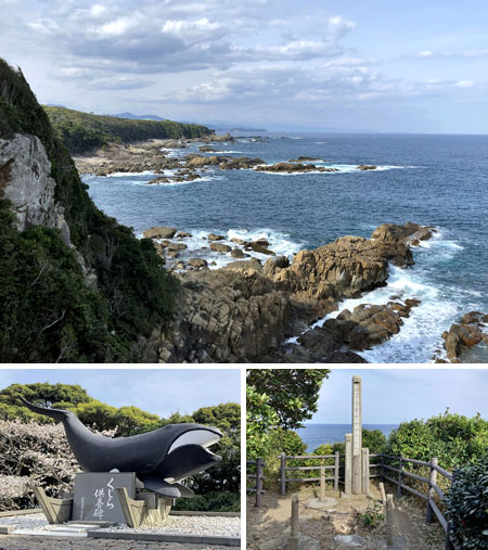 和田の岩門の2km先にある梶取崎園地にやってきました。江戸時代から明治時代まで、”山見”と呼ばれるクジラの見張り場があったところで、狼煙窯の跡が···