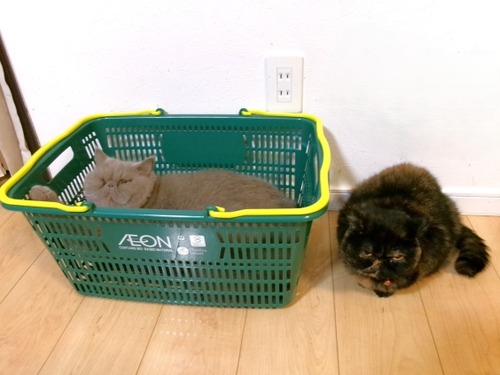 ありゃ~?なるくん… 買い物カゴに入っちゃったのねぇ~荷物を出してる隙に入られちゃいました…そして… その隣にはこんちゃんの姿が…こんちゃんもカゴ···